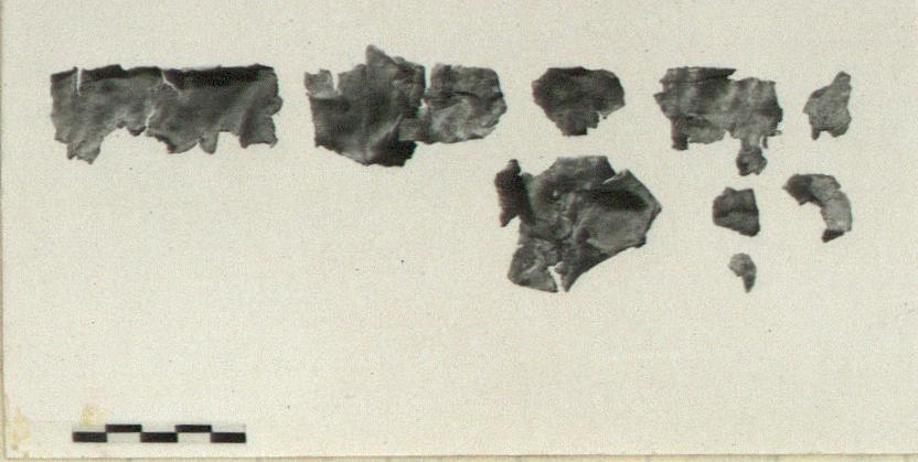 | Description: | Broken into three large and several small pieces upon partial unfolding. Found wadded up and crushed in numerous layers. Hole for nail that has disappeared. A number of obscure letters on inside, including many crosses or "chi 's". | |