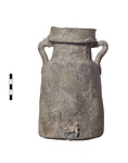 | Description: | Lead jug. Complete. Warped, dented, and cracked in places, with some incrustations, otherwise well preserved. Molded ring base. Cylindrical wall sloping in toward top. Inset neck; flanged rim, grooved on top. Two vertical handles from shoulder to just below rim. Lead. | |