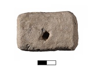 | Description: | Covered in a layer of corrosion. Nicks around the hole and at one corner most likely ancient. Rectangular weight rounded at corners. Large square hole (slightly off-center) pierced almost through the other side. Flat underside. Slightly thickened at both shorter edges. | |