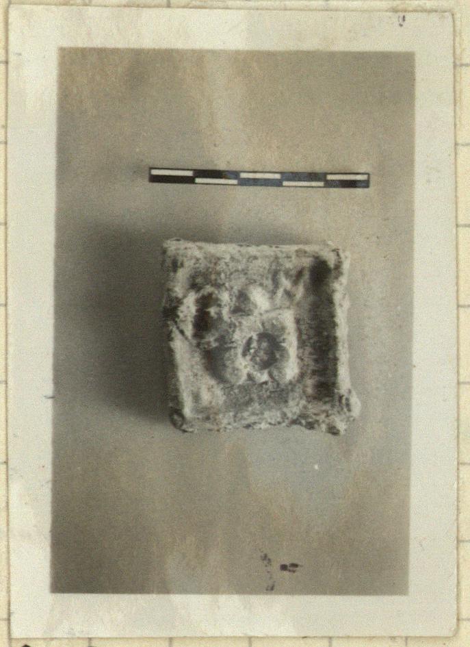 | Description: | A square one. Raised edge around upper side; in relief in middle a square with round depression in the middle. | |