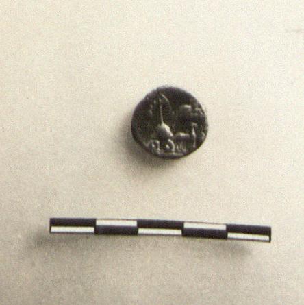 | Description: | Obverse: a team of long-necked animals (horses) to right draws a cart which carries a bell-shaped object with a standard rising from its top. On top of the standard, a triangle with flying fillets. In field to right, indeterminate object. The ship 's standard or stylis, symbolizing the ship of Dionysos, and carried in the Heiros Gamos procession. Above at the right, over the animals ' heads, a ledge-like projection, uncertain; an animal crouching on its top (?) Reverse: flat, plain. Cf. Deubner (1932), Attische Feste, pp. 105-106, pls. 11, 2 and 3, 12. | |