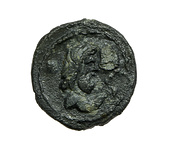 | Description: | Obverse: head of Athena, in crestred Corinthian helmet, right. Stars in field. All within border of dots. Reverse: head and shoulders of Poseidon, right. In field, right, dolphin and trident. All within border of dots. | |