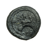 Reverse: Triton with attributes and stance of Poseidon, left, holding dolphin in right hand, trident in left. Countermark of stork and lizard. Inscription not clear.