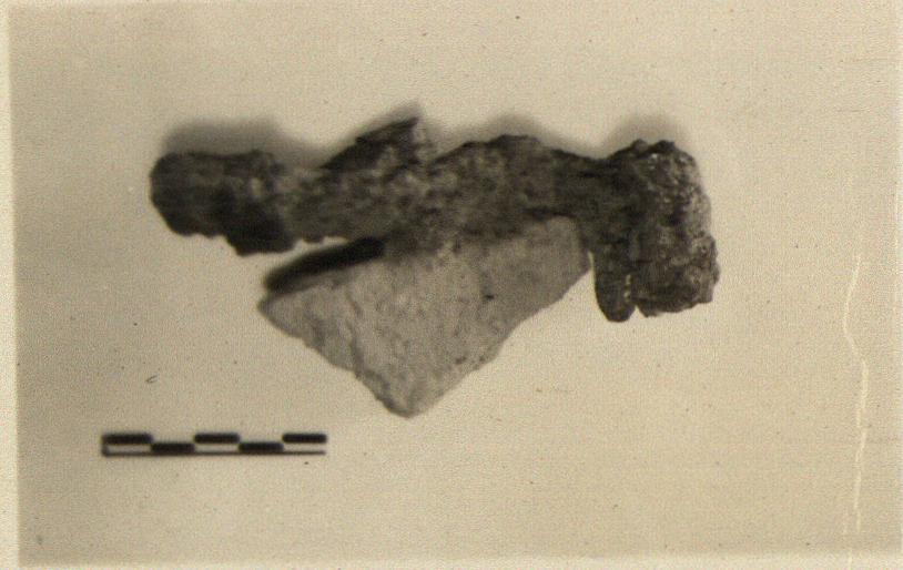 | Description: | Apparently completely preserved, but oxidized and with thick incrustations. Loop at handle and five teeth set at right angles to shaft. | |