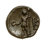 | Description: | Obverse: clear impression of a figure (soldier ?) in helmet, cuirass and tunic, standing holding a spear upright in his left hand, and a wreath extended in his right. To the right, the letter K. Reverse: plain. | |