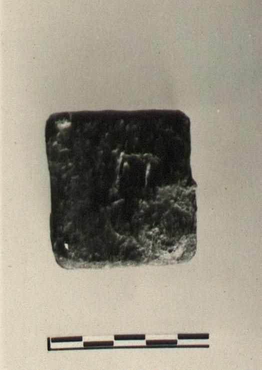 | Description: | Roughly rectangular, one side somewhat concave. The letters Α Π scratched on top surface. | |