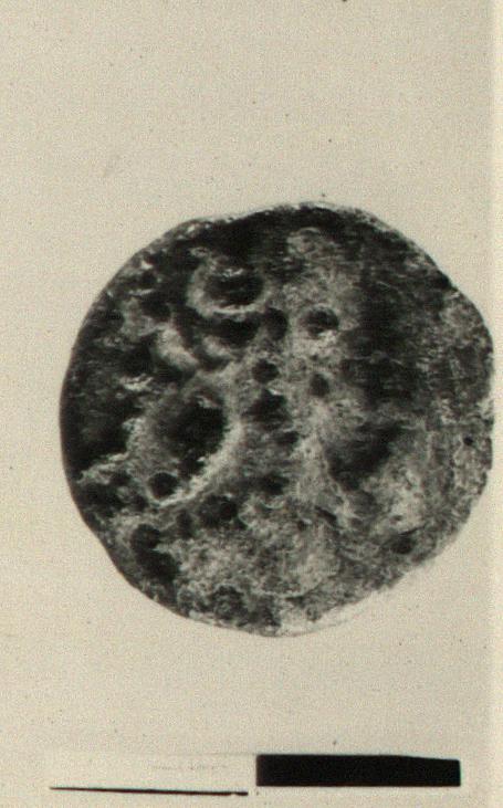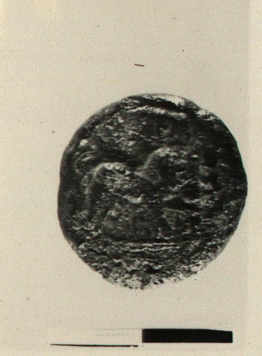 | Description: | Obverse: horse standing right. In field below his muzzle, a star (?); in field above, uncertain letters or symbols. Reverse: plain, rough, with irregular raised dots. | |