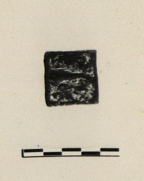 | Description: | Small square weight with elongated object (dolphin ?) and letters (uncertain) in relief on upper face. (Twenty drachmas in the Attic-Euboic standard equal 86.2 gms., seventeen drachmas equal 73.3 gms.). | |