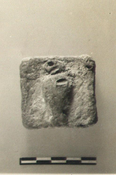 | Description: | Complete; slightly damaged on upper surfaces by pick. Square one, plain on lower surface; on upper surface, within a low raised border, an amphora. No letters visible. | |