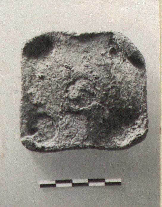 | Description: | Somawhat bent at corners. A rectangular plaque with five circular stamps, one in each corner and on in the center. Each stamp has a different (?) device. <graphic> | |