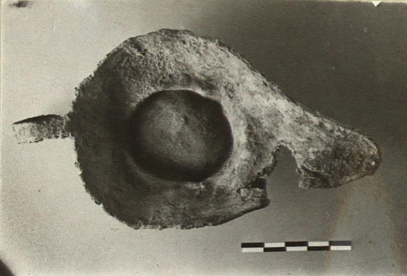 | Description: | Complete except for chip from one side. Somewhat bent. Wide shallow lamp with flaring sides, low base and long open nozzle. The handle is a rectangular band attached at the rim and curved down to form a ring. | |