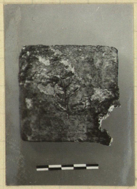 Rectangular plaque; the surface slightly curved on one side; an incised pine tree in center.