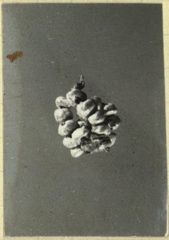 | Description: | Seed pearl cluster strung on thin gold wire. The cluster formed by four small strands, wound together at one end, and finished with an added piece of gold leaf at the other. | |