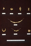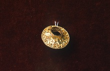 Bottom is hollow plain hemisphere with hollow wire leading out. Top made of separate piece folded over bottom piece with seam below corner. Top has projecting hollow cylinder (for gem setting ?). Applied decoration: braid at corner. Alternating ivy leaves and "S" s (four at each). Triangles of three granules between each ivy leaf, single granule between each ivy leaf and S at base of cylinder.