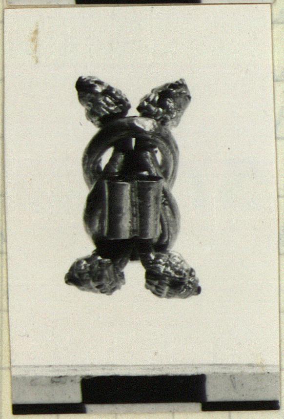 | Description: | Intact. Ornament consists of a loosely drawn knot with the ends (two at each end) terminating in small lion heads. On underside are two loops for attachment. | |