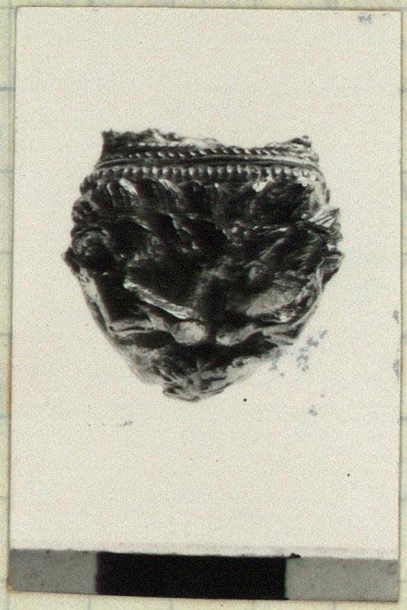 | Description: | Lion 's head. Broken away at neck. Head squashed when found. Ornament is lion 's head with fine gold braid at neck. Probably end of bracelet. | |
