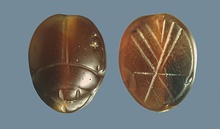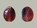 | Description: | Intact. Small chips around edges. String hole through long axis. Slightly domed upper surface with engraved lines in shape of beetle. Curved line across middle separating head from back. Bisecting line from midpoint to back edge to render the two wings. Carved eye on head. Line running all the way around just below top edge. Flat underside carved with two lines crossing in an unequal "X", a line running horizontally through the point where the lines cross, and the longer end of the cross filled with parallel lines. Cf. Pylos III, 194:25. Addenda 2024: Dark red (7.5R 3/6) carnelian with reddish black (7.5R 2.5/1) vein. Compare, Crete: CMS III, Kat.Nr. 025 (but chlorite); Knossos: CMS II,2, Kat.Nr. 056 (but rock quartz); Aidonia: CMS V Suppl. 1B, Kat.Nr. 124 (but glass paste). | |