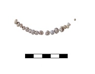 | Description: | Seventeen small beads. Four are intact. Twelve others are friable and iridescent. The smallest one was broken during handling. Roundish beads, some more flattened than others, pierced through the center. White creamy glass paste. | |