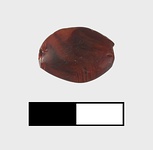 | Description: | Complete, surface slightly nicked. Amygdaloid shape, rounded?? edges. Pierced longitudinally through center. Polished dark red opaque carnelian with back veins. For sequence amongst other beads, see BZ LIV, p. 10610, no. 4. | |