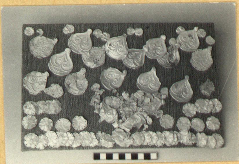 | Description: | Two crumpled bits of thin gold, perhaps with some trace of relief decoration. The smaler has piercing which may be original. | |