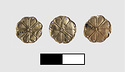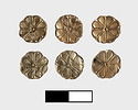 | Description: | This group consists of thirty rosettes, five ivy-leaf pieces and one shell-shaped ornament. Ivy-leaf ornaments: four of them are complete, though slightly bent; one is somewhat broken. Decoration in low repouseé: a conventional ivy-leaf formed by two volutes crowned by curving lines. None are pierced. Cf. J 64. Shell-shaped: lower edge straight, upper edge scalloped; converging flutes running downward; small eight-petalled rosette in center. Pierced at edge. Cf. J 84. Rosette: one of the rosettes is half only; the others are largely complete, though slightly bent and with occasional chips missing. Eight-petalled rosette with central dot; pierced around the edges for attachment. | |