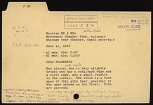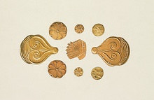 | Description: | Two shell-shaped pieces. One is slightly broken, the other is a bent mass of thin gold. Lower edge straight, upper edge scalloped. Converging flutes running downward; small eight-petalled rosette in center. Pierced at edge. | |