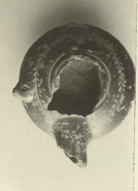 | Description: | Broken at tip, and around central opening. Vertical band handle broken away. Watch-shaped profile with groove around filling hole. The groove scraped; the top decorated with a wreath in clay colored paint. Pierced lug. "West slope" decoration. Metallic black glaze inside and out. Type IX of Corinth collection, type 29A of Agora collection. | |