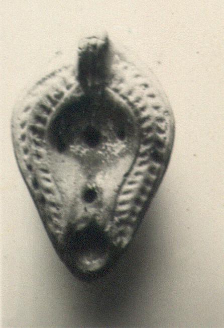 | Description: | Complete. Herringbone on rim; plain pear-shaped discus with broad channel to nozzle, and five oil holes. Solid handle, double grooved above and below. On the reverse a double almond-shaped groove, with small impressed circles; two at the base of the handle, one at the base of the nozzle, and four more inside the grooves. Signature on the bottom. Buff clay, the top blackened. Type XXVIII of Corinth collection. Cf. L 1029, etc. <graphic> | |