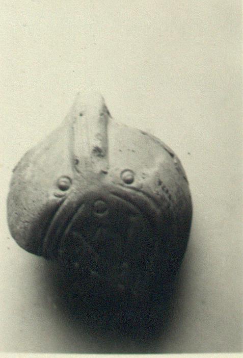 | Description: | Fragment from back part. Concentric circles on the rim; the handle solid, a hatched band on the upper part, double grooves below. On the reverse, double almond-shaped grooves; two small circles at the base of the handle and another below; within, the signature. Unglazed. Pinkish-buff clay. Type XXVIII of Corinth collection. <graphic> | |