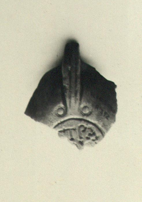| Description: | Fragment of bottom. Two small circles at the base of the double grooved handle. A single circular groove enclosing the signature. Red wash, blackened inside and out. Buff clay. Type XXVIII of Corinth collection. Cf. Corinth IV, ii, no. 946. Cf. L 982, L 699. <graphic> | |