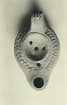 | Description: | Complete. Herringbone on rim; plain concave discus with four filling holes; handle solid, triple grooved above, double below. Palm leaf-shaped on reverse, with double bounding lines starting from two small circles at the base of the handle. Within, the signature "Σ Ω", with one small circle above and two below. Pinkish-buff clay, somewhat blackened on top; the surface peeling. Type XXVIII of Corinth collection. Cf. L 1029, etc. | |