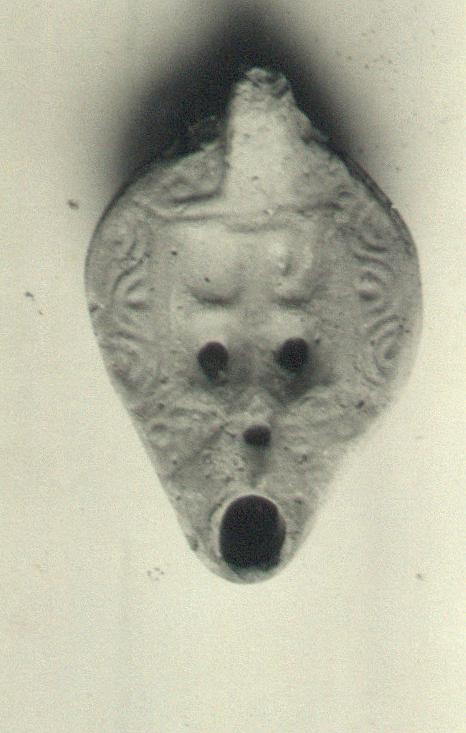 | Description: | Wavy lines on the rim, with groups of three dots on either side of the handle and nozzle. Christian monogram on square discus; the tail of the "rho" to the right; filling holes in the lower quadrants. Handle solid, double grooved above and below; the surface worn, and a large chip missing from the back. Double almond-shaped grooves on the reverse, enclosing a palm branch. Quite possibly slipped. Pinkish-buff clay, grayed on the lower part. Type XXVIII of Corinth collection. | |