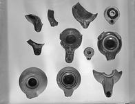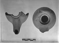 | Description: | Nozzle broken. Profile with addiotional grooves. Rim grooved, with sunken area around central filling hole. No handle. Nozzle deep and broad. High base. Unglazed. Pinkish-buff clay. Type VIIB of Corinth collection, type 25A' of Agora collection. ADDENDA For profile cf. Corinth IV, ii, p. 32, fig. 14, profile 34. | |