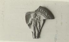 | Description: | A bit of the rim, with impressed ovules, and most of the figure of Hermes on the discus preserved. He stands facing slightly to his left, with the left leg bent, and he looks back over his shoulder, to his right. In his left hand he holds the caduceus; his right hand, extended, is missing, as are his feet. Unglazed. Fine yellow-buff clay. Type XXVII of Corinth collection. Late 2nd.-3rd. centuries. | |