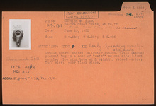 | Description: | Double convex sides; slightly sunken, plain discus; pierced lug in a sort of "swirl" on one side; blunt nozzle; low ring base with slightly raised center. Poor black glaze. Wheel made. Buff clay. Type XII (early spreading variety) of Corinth collection, type 32 of Agora collection. | |