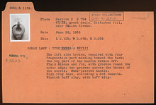 Description:   The left side broken, repaired with four fragments; a part missing toward the back; the top part of the handle broken off.