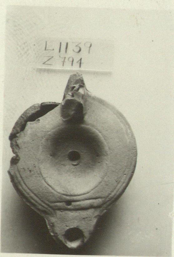 | Description: | The left side broken, repaired with four fragments; a part missing toward the back; the top part of the handle broken off. Plain discus and rim, with grooves round the outer edge; two grooves across the throat of the nozzle. Semi-pierced handle. High ring base, enclosing a dot rosette. Buff slip. Pinkish-buff clay. Type XXVIII of Corinth collection. | |