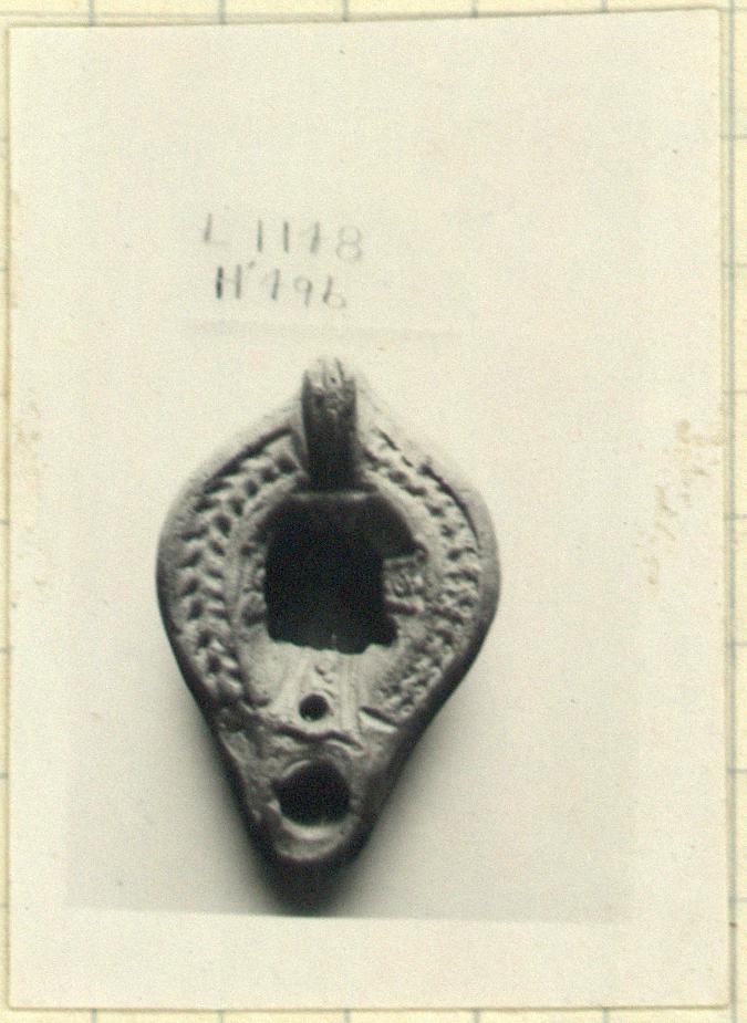| Description: | Most of the center of the discus gone. Convex sides; herringbone on rim; Christian cross on discus with circles in the arms; solid handle, double grooved on top; on the reverse, within double almond-shaped groove, a palm branch. Unglazed. Light reddish-buff clay. Type XXVIII of Corinth collection. | |