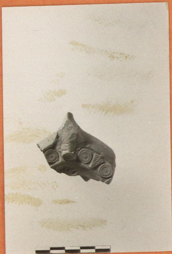 | Description: | Handle broken. Large part of discus missing. On rim, alternating trees and circles. On discus, traces of a set of small concentric circles with crescents around it. Handle solid. On bottom, low base ring connected with the handle by a ridge. Red glaze. Red clay. Type XXXI of Corinth collection. | |