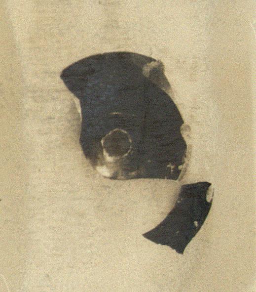 Description:   One piece preserves the cone and a part of the rim; the other a small piece of the rim and the edge of the wick hole.