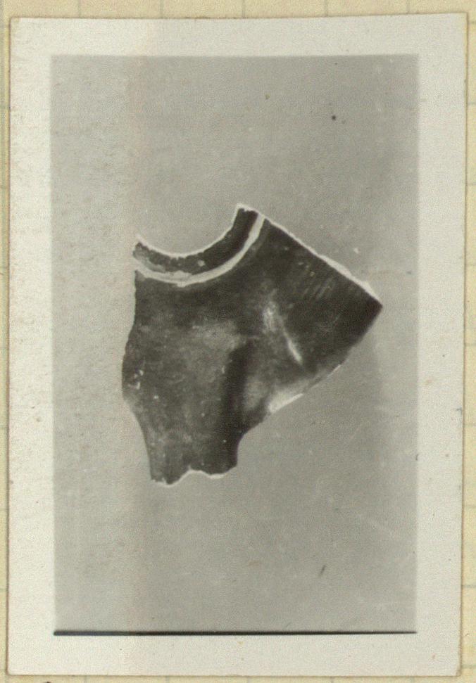 Black glaze, rather discolored, on top, inside and out. Groove about filling hole reserved. Wheel made.