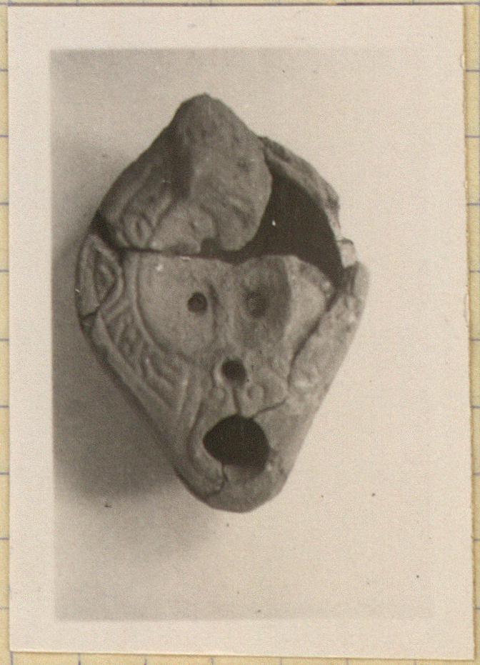 | Description: | On rim, wavy lines. On discus, Christian monogram with loop right, and air holes between the arms of the cross. Handle grooved. Nozzle with stamped circles inside. On bottom, double almond-shaped groove with palm branch and stamped circles. Unglazed. Pale red clay. Type XXVIII of Corinth collection. ADDENDA For nozzle cf. Corinth IV, ii, p. 105, fig. 49, no. 4. | |