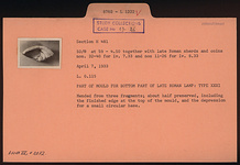Description:   Mended from three fragments; about half preserved, including the finished edge at the top of the mould, and the depression for a small circular base.