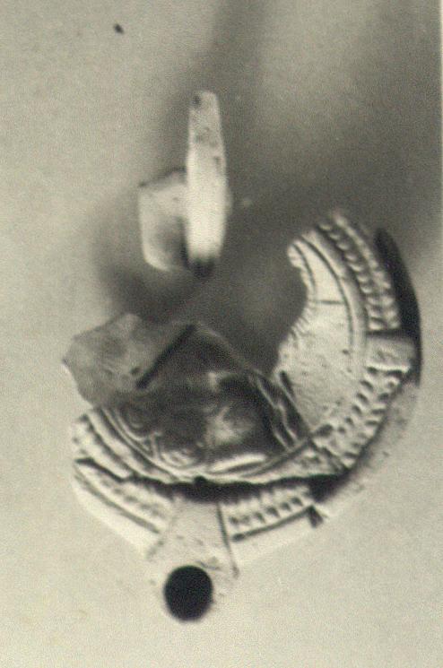 | Description: | Part of the front and of one side preserved; the handle does not join, is triply grooved and pierced. Fragmentary. Panelled herringbone rim; on the discus, bust of helmeted Athena, left, only the lower part preserved. On the reverse, remains of a signature, within two grooves. Unglazed. Fine buff clay. Type XXVII of Corinth collection. <graphic> | |