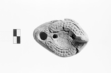 | Description: | Mended from several pieces. On the discus a bird, in a relief. Double row of raised dots on the rim. Solid handle. On the bottom, two almond-shaped grooves with four circles between the grooves, and a line down the middle. Technique recalling type XXVIII of Corinth collection. | |