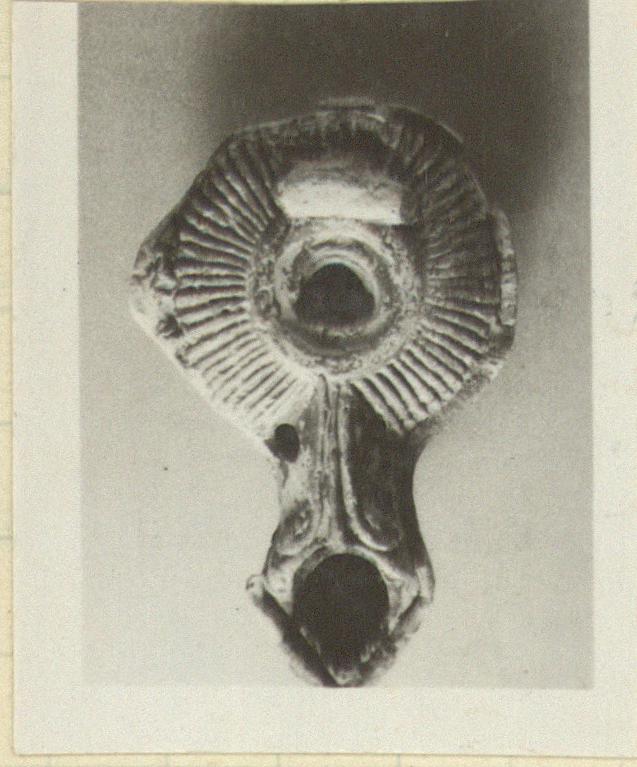 | Description: | The vertical handle, and the raised edge around the top missing. Two small holes by the nozzle. Inscribed in relief underneath. Type XVIII of Corinth collection, type 52C of Agora collection. <graphic> Cf. L 4127, L 3307. | |