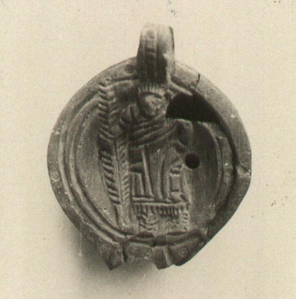 | Description: | Nozzle broken. On rim, stamped circles around double groove. On discus, standing male figure, imperial Byzantine type, with long palm branch in right hand. Handle solid, with hatched band. On bottom, double concentric grooves, with palm branch. Unglazed. Dark red clay. Type XXVIII of Corinth collection. | |