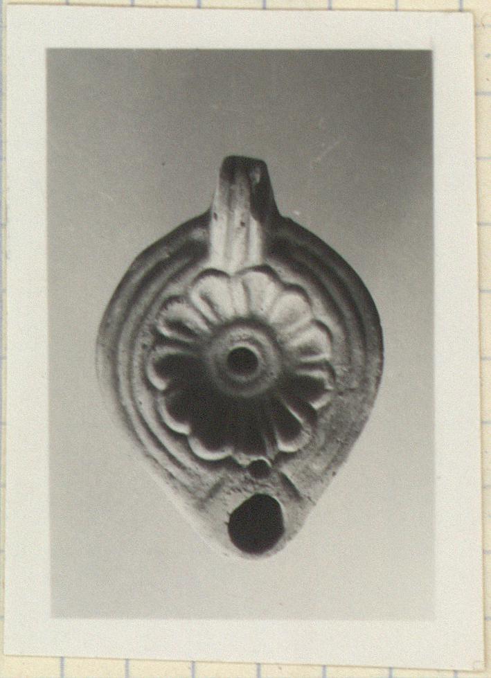 | Description: | A chip of the handle is missing; otherwise intact. Two grooves on the rim. The handle grooved but unpierced. On the reverse, within two heart-shaped grooves, a palm brand. Rosette on the discus. Thin dull reddish glaze. Type XXVIII of Corinth collection. Cf. Corinth IV, ii, pp. 102-114, nos. 786-1412, pls. XIII-XIX. | |