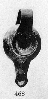 | Description: | Long nozzle; vertical handle broken off. Large knob on left side; rim depressed. Ring foot. Wheel made C. Black glaze. Type XII (late straight variety) of Corinth collection, type 35A of Agora collection. | |