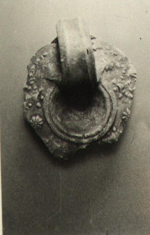 | Description: | Nozzle and lower part missing. Vertical loop handle. Moulded rings around small concave discus. On the rim, moulded decoration consisting of boukrania with garlands looped between them, and between each boukranion, a flower. Type XVIII of Corinth collection, type 57 variant of Agora collection. Cf. L 2203. | |